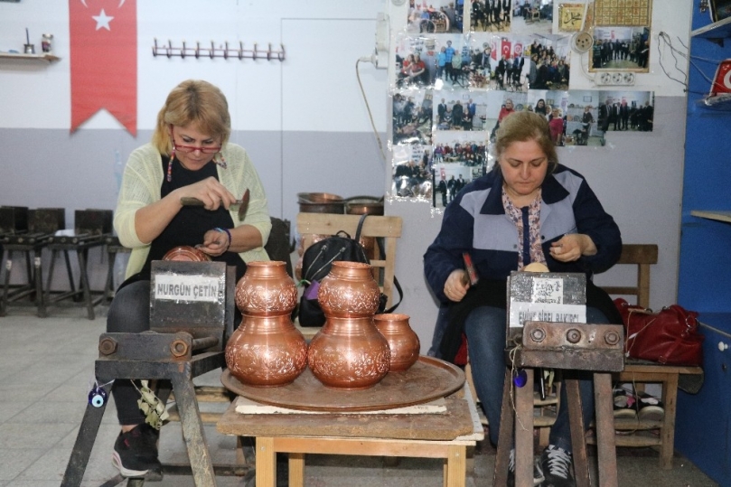 Gaziantep’te bakırcı kadınlar bakır hediyelik eşyaları süslerken, akşam ise iftar sofralarını süslüyor.